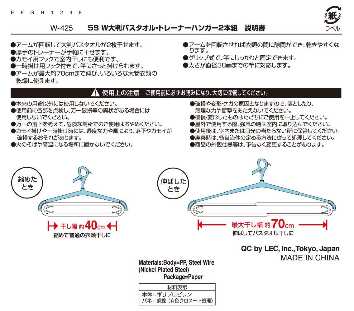 本体サイズ: (45.5~76)×1.5×25.5cm 本体重量(kg):0.147 特長: こだわりの機能がつまった「5つ干し」の特殊ハンガーです。
