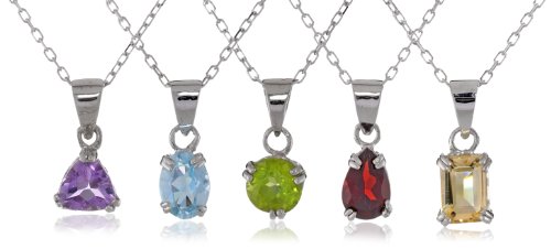 The color possibilities are endless with the Five Interchangeable Gemstone Options: Peridot, Garnet, Amethyst, Blue Topaz, and Citrine Pendant Set. Each of the five pendants in this set fit an 18-inch rolo chain. The natural gemstones are held in prong settings which showcase the unique cut of each stone, bringing variety to your wardrobe. A simple way to add a pop of color to any outfit, day or night. Set includes: 1 Sterling Silver chain & 5 gemstone pendant pieces.Feature