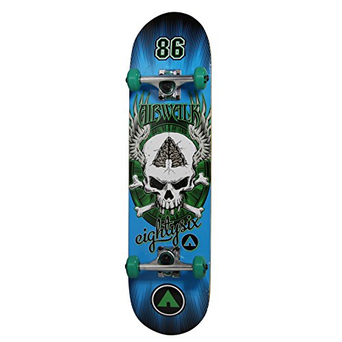 -. Binding : Sports -. Brand : Airwalk -. Feature : Made of sturdy, 9-ply maple wood and finished with anti-slip grip tape on top side of deck for more perfect riding every time / Includes 52mm street wheels ideal for skating outside on sidewalks, ramps, and rails / Attached with 5" aluminum trucks for stability and quicker turning yet lightweight for tricks / 31" x 7.75" deck, double kick tail with concave ideal for perfecting your favorite tricks like an Ollie, kick-flip, heel-flip, or manual / ABEC-1 skateboard bearings classified for their precision parts and tolerance -. Label : Airwalk -. Manufacturer : Airwalk -. Model : AW01005UD7-Purple-P -. ProductGroup : Sports -. ProductTypeName : OUTDOOR_RECREATION_PRODUCT -. Publisher : Airwalk -. Studio : Airwalk -. Title : Airwalk Undone Skull Skateboard