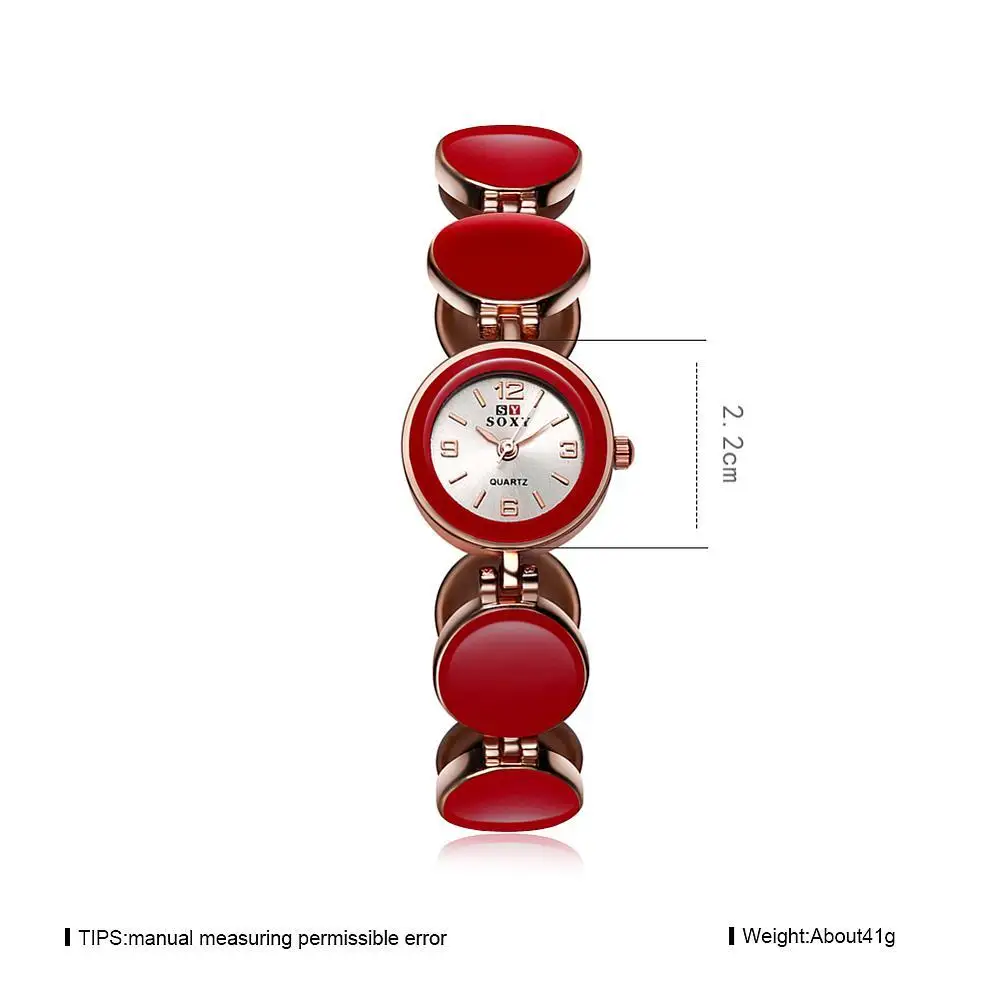 상품 내용 여성 팔찌 시계, 합금 석영 유리 시계, 레드, 로즈 골드 크기: 직경 다이얼: 약 22 미리메터. 케이스 두께: 약 10 미리메터. 밴드 폭: 약 10 ~ 19 미리메터. 밴드 길이: 약 195 미리메터.