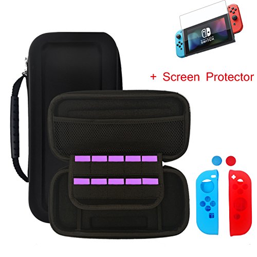 -. Feature : Provide Full Protection - Package included 1 x Carring Case; 1 x Screen Protector; 1 x Protective Skin. Specifically Designed for Nintendo Switch, protect your device from dust and scratches, protect your device against breaking and surface damage caused by accidental drops. / Durable Material- Adopt good qualiy EVA, features light weight extra-thick shell, waterproof scratch-resistant and can survive multiple drops. durable all around zipper which holds your device securely in the case. / Keep Stuff In Order - elastic band to fix your game console and keep your Nintendo Switch firmly, mesh pouch inside to hold other accessories, provide more securty for your Nintendo Switch. / Large Storage - This Carring Case fit perfectly with joy cons attached, a large bag inside with elastic band allow you to put the rechargeable cables, earphone and other supplies, Contain 10 independent card ports to hold your game cards, so that you have more fun with more games. / Easy To Carry - Slim apprence and lightweight, this storage case would not taking too much space on your backpack, handbag. With handle for easy carrying, you can enjoy the game in everywhere! Perfect carry case for keeping your Nintendo Switch securely stored when travelling!