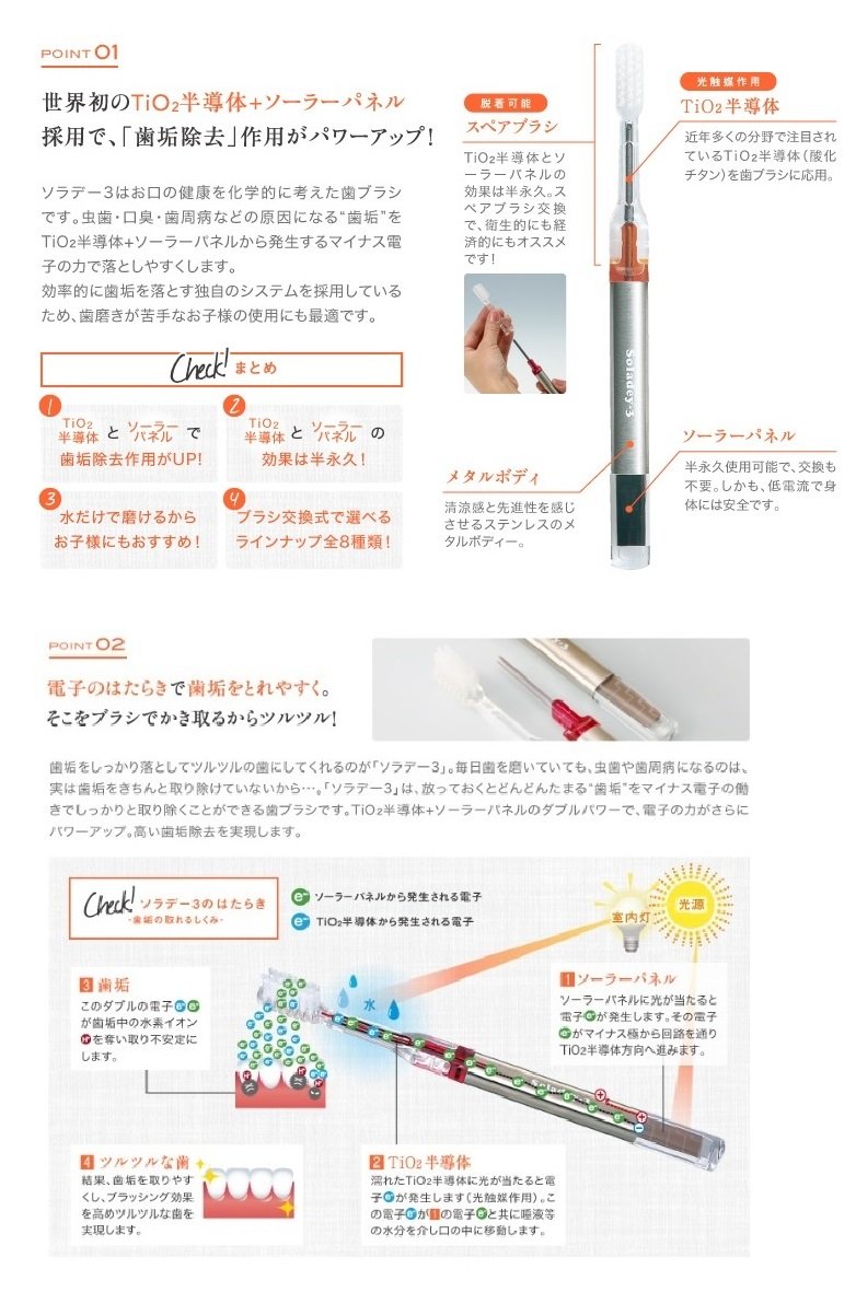 · It will make it easy to drop "plaque" which causes causes like tooth decay, bad breath, periodontal disease etc. with the power of minus electrons.