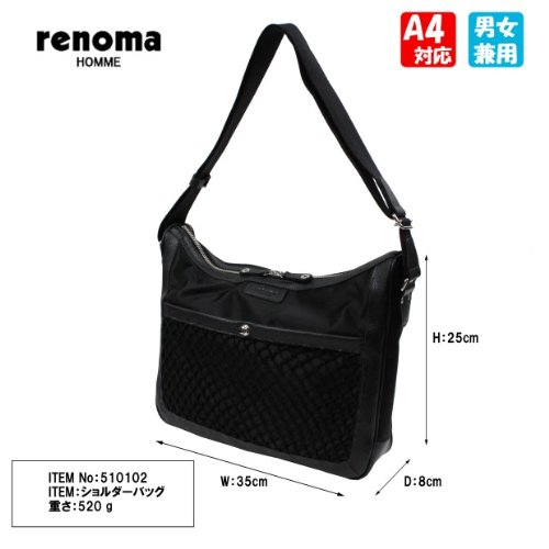 Product Description renoma Renoma the former shoulder bag Renoma of the world by storm in A4 size 51010280's fishnet bags and Renomashibo material, contemporary and series finished in casual taste. Body material, fine count with elegant shiny, use a nylon twill of tenacity yarn, it is a point and used to stain the fish net, which is also the symbolic icon of Renoma in black. The companion, uses the same Renomashibo PVC in which the antique Renoma to reference. A fish net and Renomashibo unified in black, and the use of body material shiny, by making the fasteners and metal fittings and nickel plated shiny, they represent the now-ish sense and a sense mode of renoma homme you.\nProducts will be shipped from Japan.If tariffs are necessary,Customer should bear it. 0