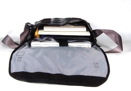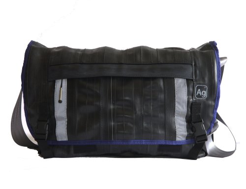-. Feature : Durable, water-resistant messenger bag / Exterior is made from upcycled bicycle inner tubes / Shoulder strap made from an upcycled seatbelt / Reflective tape makes it highly visible / Measures 14.5 inches by 4.5 inches by 9 inches