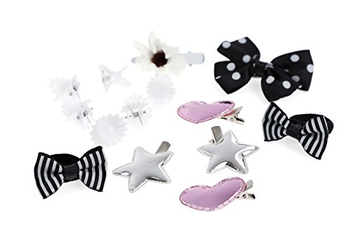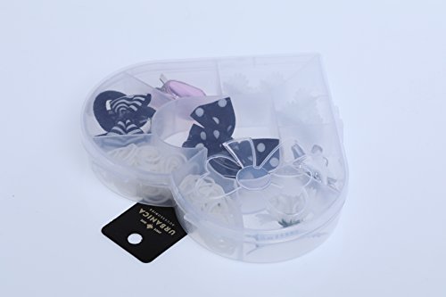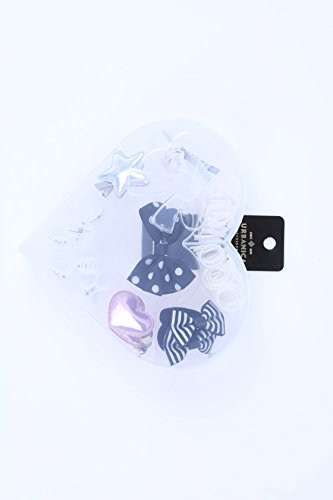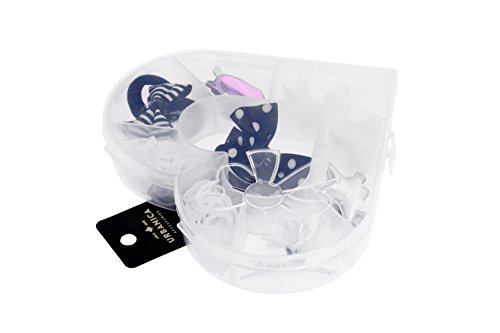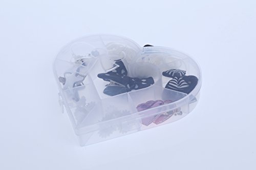 ALL IN ONE ? Complete with 3 types of hair accessories HAIR CLIPS ? Several charming designs HAIR RUBBER BANDS ? Small size elastic bands that do not slide off ALLIGATOR CLAWS ? Hearts, stars, polka dot / striped bows QUALITY MATERIAL ? Bows are soft, stretchy, washable EMBELLISHMENTS ? Made with non-toxic glue 2 CONTAINER CHOICES ? Choose from HEART or BUTTERFLY SHAPED BOXES MULTIPLE SECTIONS ? Each clear box with lid has dividers ENVIRONMENTALLY SAFE ? Box is non-toxic ABS plastic