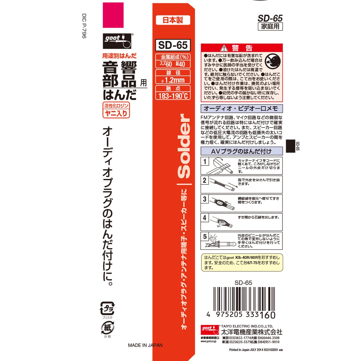 ● Product Size Width 19 × Height 96 × Length 19 mm Weight 27 g ● Product Code: 4975205333160 ● JAN Code: 4975205333160 ● Brand Name: Good ● Product Name: Solder for Acoustic Parts ● Standard: SD-65