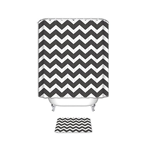 Black and White Chevron Bathroom Shower Curtain Set with Bath Mats Rugs, Classic Bold Design, Mildew Free