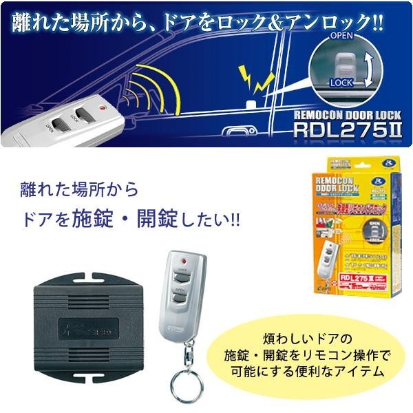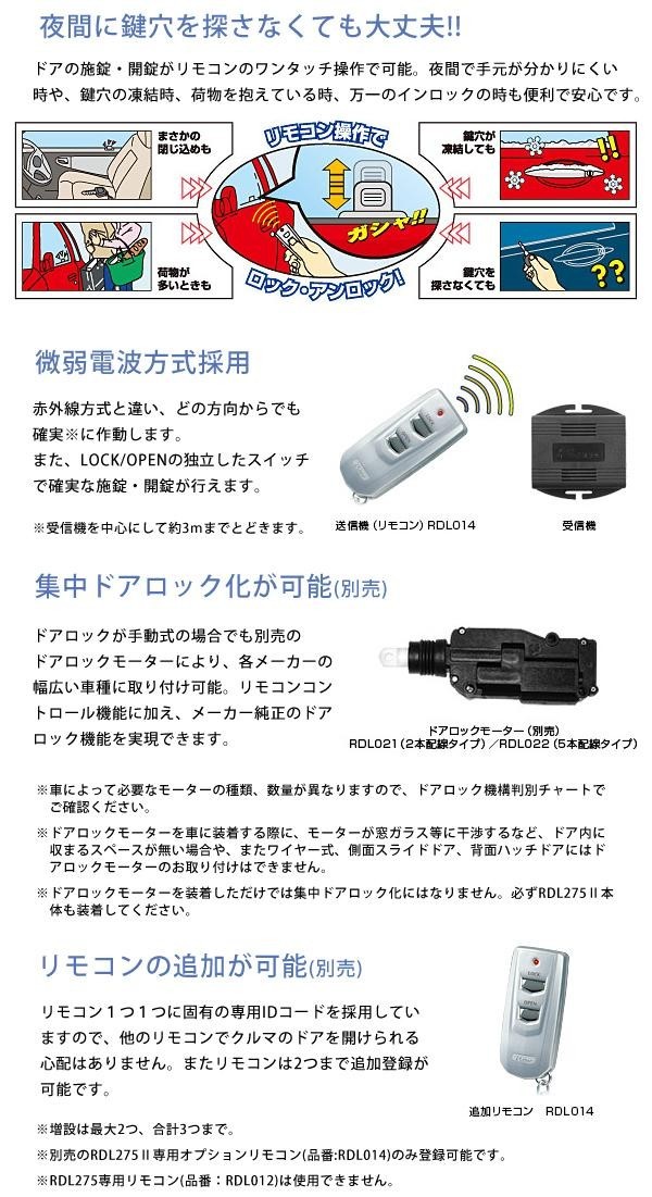| リモコンドアロックRDL275IIは、煩わしいドアの施錠・開錠をリモコン操作で可能にする便利なアイテム。メーカー純正では装備されていないクルマでも手軽にキーレスエントリーを実現します。また、ドアロックが手動式の場合でも、オプションのドアロックモーターを追加すれば、キーレスエントリーはもちろん、メーカー純正のリモコンドアロック装着車と同じように集中ドアロック化も可能。 |