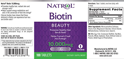 Clinical studies indicate that those with deficiencies of biotin can experience brittle nails and hair loss. By taking Natrol Biotin daily, you can improve strength of nails, healthy hair and radiant skin. Biotin supports the growth of cells and production of fatty acids which can increase the bulb size of hair follicles, which helps to make hair appear fuller and thicker.