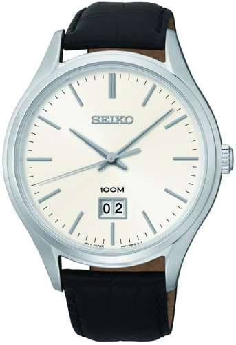 Seiko 남성용 시계.실버 스테인레스 케이스 와 블랙 천연 가죽 스트랩. 화이트다이얼.쿼츠 동작.버클(버클) 잠그개.방수 가공 100 미터.