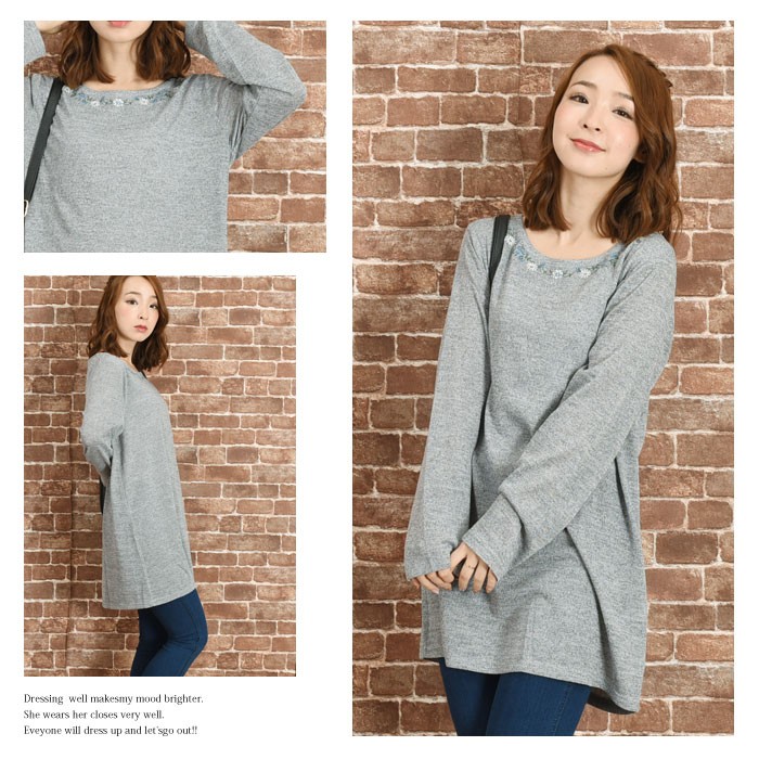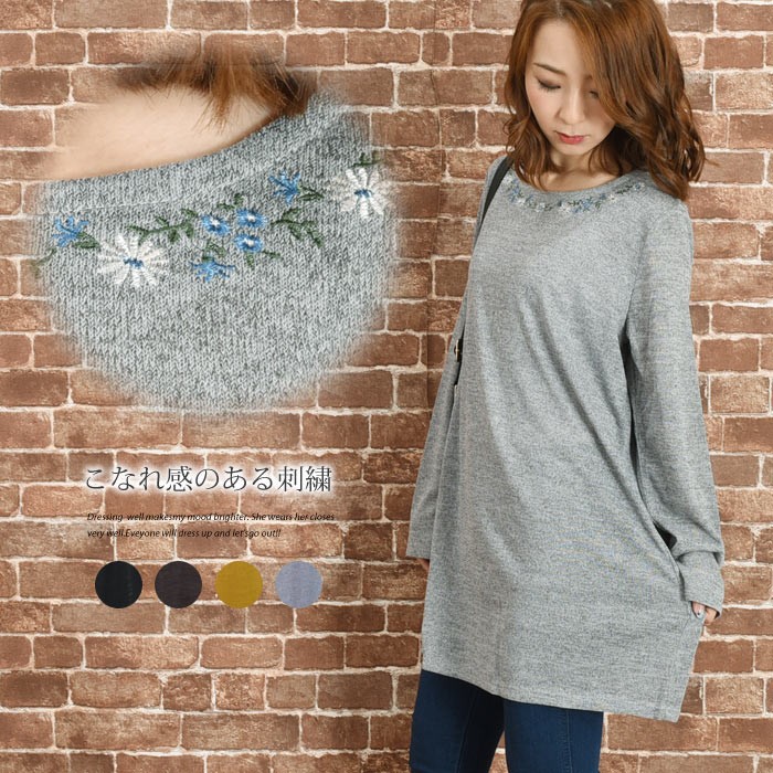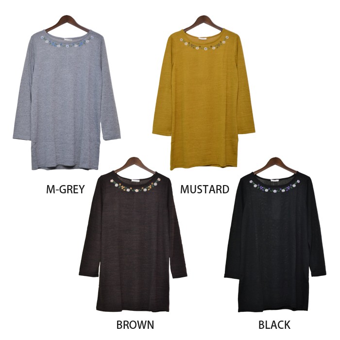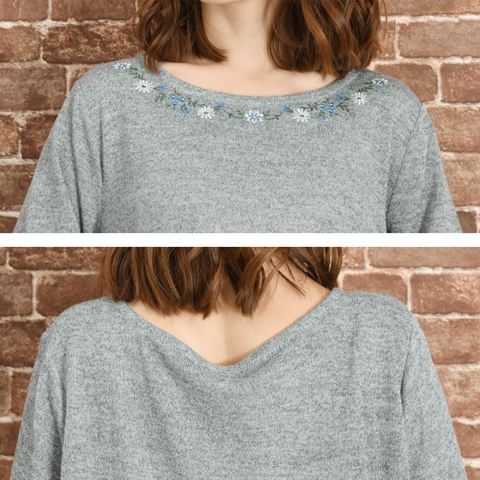 胸元には、存在感のある花の刺繍が付いていてフェミニンな雰囲気になっています。