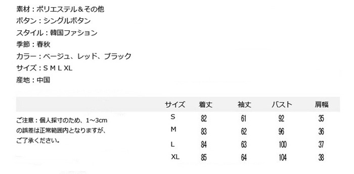 プリングコート レディース トレンチコート ライトアウター 大きいサイズ 春アウター ロング丈 ミディアム 高品質 (送料無料特価販売中) スプリングコート レディース キルティングコート 大きめ商品詳細素材:ポリエステル&その他ボタン:シングルボタンスタイル:韓国ファション季節:春秋カラー:ベージュ、レッド、ブラックサイズ:S M L XL産地:中国サイズ参照表S 着丈82cm 袖丈61cm バスト92cm 肩幅35cm お勧め体重42.5~50キロM 着丈83cm 袖丈62cm バスト96cm 肩幅36cm お勧め体重50~55キロL 着丈84cm 袖丈63cm バスト100cm 肩幅37cm お勧め体重55~60キロXL 着丈85cm 袖丈64cm バスト104cm 肩幅38cm お勧め体重60~72.5キロご注意:個人採寸のため、1~3cmの誤差は正常範囲内となりますが、ご了承ください。プリングコート レディース トレンチコート ライトアウター 大きいサイズ 春アウター ロング丈 ミディアム 高品質 (送料無料特価販売中) スプリングコート レディース キルティングコート 大きめ