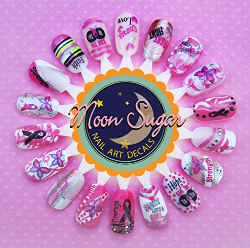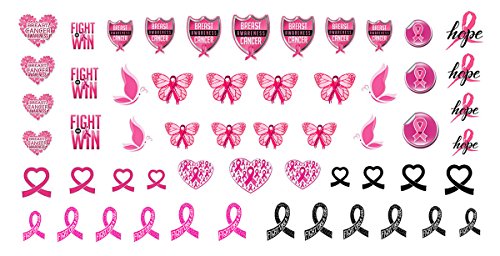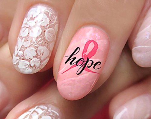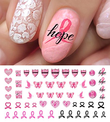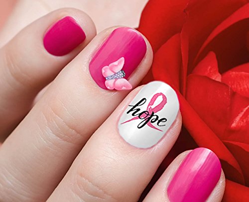 Breast Cancer Awareness waterslide nail decals. Support the cause, and raise awareness with this thoughtful design that includes ribbons, butterflies, hearts and more!. 4 Easy Steps for Application: 1) Cut the decal to fit the nail(s). They can be used on natural or artificial nails. For natural nails, apply a base coat first. For acrylic nails, a base coat is not necessary. 2) Place your decal in a bowl of warm water. It will curl up and then straighten out again. Once they are laying flat again, they are ready to slide off the paper backing and onto your nail. NOTE: THESE ARE PRINTED ON A CLEAR FILM SO THERE IS NO WHITE INK. For best results apply to a white or light colored nail. 3) Place the decal straight onto the nail in desired position. 4) Dab dry with a tissue & finish with a layer of clear acrylic or top coat to seal. These decals are slightly thicker than others because we hand coat them, meaning they are very durable. They won't curl or rip during application. The color won't bleed as you soak them. They are also easier to manuever around your nail. 100% satisfaction is guaranteed.Feature