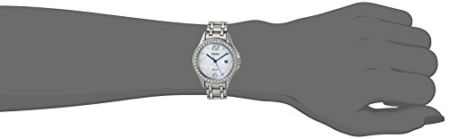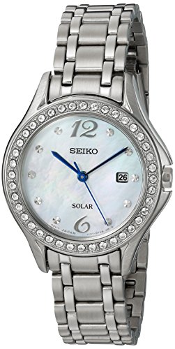 Web exclusive! From work to dinner parties, this Seiko women's solar watch is a fashionable solution to staying punctual. The mother of pearl dial and Swarovski crystal accents give this accessory a glamourous flair while the blue minute and hour hands are both attractive and easy to read. And don't worry about being caught in rainfall - this Seiko ladieswear is water resistant up to 30 meters.Feature