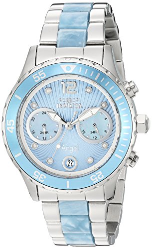 Stainless steel case with a stainless steel bracelet with blue pearlized resin center links. Uni-directional rotating silver-tone bezel with a blue aluminium top ring. Blue dial with luminous black hands and dot hour markers. An Arabic numeral appears at the 12 o'clock position. Dial Type: Analog. Luminescent hands and markers. Date display at the 6 o'clock position. Dual 24 hour sub-dials. Caliber: VD57 quartz movement. Scratch resistant flame fusion crystal. Pull / push crown. Solid case back. Case size: 40 mm. Case thickness: 15 mm. Round case shape. Band width: 20 mm. Band length: 7.25 inches. Fold over clasp with a safety release. Water resistant at 100 meters / 330 feet. Functions: date, hour, minute, second. Additional Info: suitable for snorkeling as well as swimming but not diving. Casual watch style. Invicta Angel Blue Dial Ladies Watch 24704.Feature