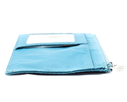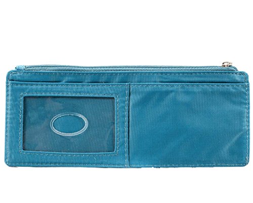 - Feature : Slim wallet with 7 stacked card pockets; holds up to 25 plastic cards / Clear ID pocket; billfold area; zippered pocket for cash, receipts, coins and more / Pockets lined with rubbery coating to prevent cards from sliding out / Constructed of thin, light and durable nylon microfiber; machine washable / Measures 3-1/2 x 7-9/16 Inch