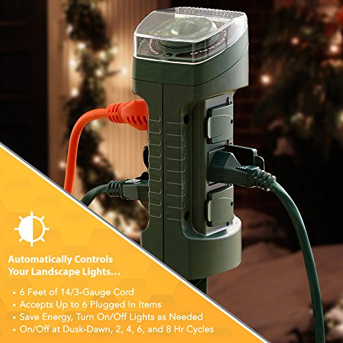 SPACE-SAVING 6-OUTLET STAKE TIMER: the yard stake timer can be accepting up to 6 plugs at a time, making it a nifty space-saving solution for your multiple outdoor lighting needs in one area; comes with a 6-feet green cord that blends in with your garden