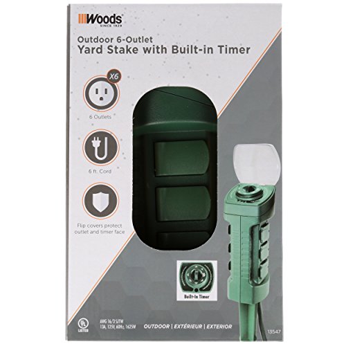 WOODS 13547WD OUTDOOR YARD STAKE WITH PHOTOCELL AND BUILT-IN TIMER, 6 GROUNDED OUTLETS, 6FT CORD, GREEN