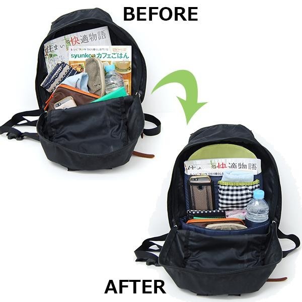 リュックの底にかたまって目的のものが探せなくてイライラ・・・という事も防げます。傾きやすいドリンクや傘なども入れるポケットあり。各種ポケットに小物が分けて入れられてとても便利です。 |
