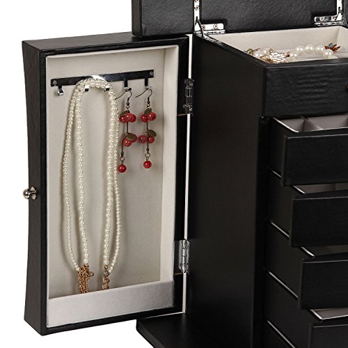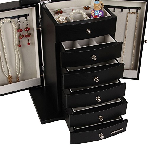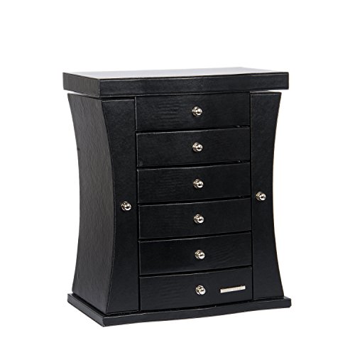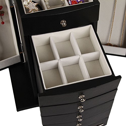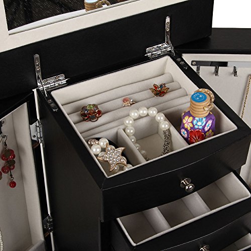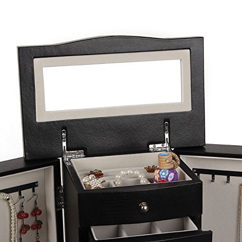 -. Brand : Rowling -. Department : woman -. Feature : - material: Wood+ Deluxe synthetic leather Exterior(not genuine leather but premium synthetic PU leather)+Velvet lining+High quality flannel interior / - Size: approx. 10.62*6.3*12.8 inches, Weights: 4.5 kg / - 2 side necklace compartments with 4 necklace hooks on each side / - 5 felt-lined drawers and 2 swing out side doors with hooks / - Safe package: 1pc/pp bag and into a thick corrugaled carton as the gift box. -. NumberOfItems : 1 -. PackageQuantity : 1 -. ProductGroup : Art and Craft Supply -. ProductTypeName : ART_AND_CRAFT_SUPPLY -. Size : 10.62*6.3*12.8 inches -. Title : Rowling Jewelry Armoires Jewelry Box Organizer with Mirror
