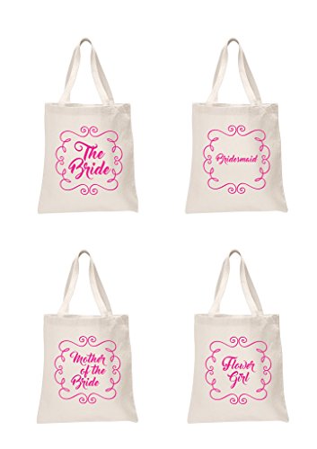 4 x Sets Natural Bridal Pink Printed Wedding Favour Tote Bags bride hen party gift sets The Bride, Bridesmaid, Brides Mother & Flower Girl