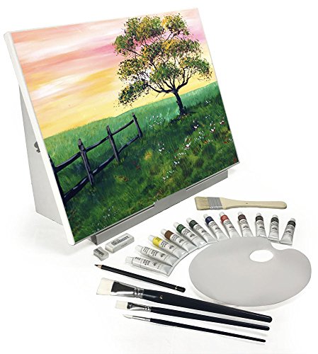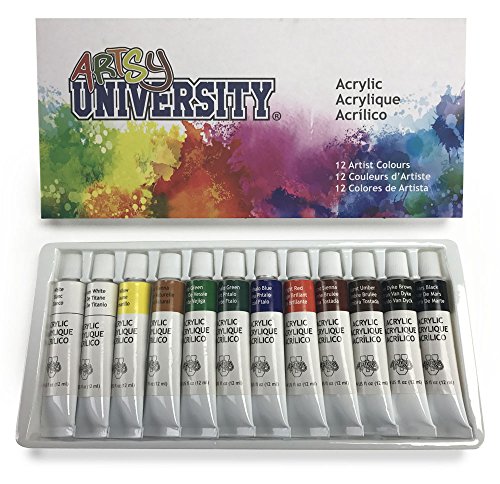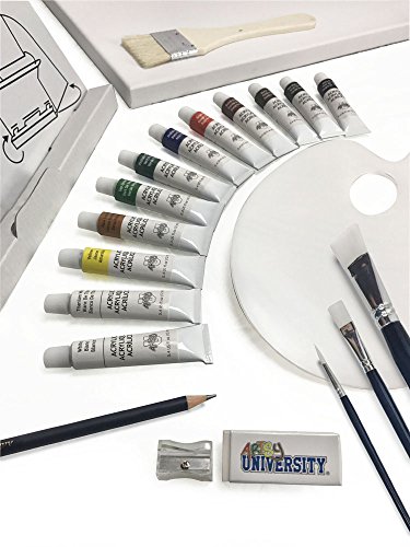The Artsy University 22 piece Acrylic Starter Art Kit contains everything you need to start acrylic painting. Extra Large 16 x 20 Gallery Wrapped Stretched Canvas • Triple primed acid-free cotton canvas stretched over a wooden frame and back stapled so only smooth edges are seen on the front and sides • Thick wooden frame allows for the sides of the picture to be painted eliminating the need to purchase a picture frame Reusable/Disposable Cardboard Easel • The easel can be painted and used to display your painting, folded flat and stored for future use, or simply thrown away after use 12 Artsy University Acrylic Paints • The beautiful colors provided, can create millions of mixed color combinations • Quick drying water based acrylic paints are made with high quality pigments to provide excellent coverage and color quality • Paint can be used on a variety of surfaces including canvas, wood, fabric and more • Packaged in easy to manage 12ml tubes • Non-toxic and conform to ASTM D4236 safety standards Reusable White Plastic Palette • Smooth, easy to clean white artist palette provides the perfect background for precise color mixing 4 High Quality Synthetic Brushes • 2 inch wide background brush for covering large areas with paint quickly • 1 inch flat brush for painting large areas with precision • Medium size flat brush and small round brush for more detailed work 6B Soft Graphite Artist Pencil with Eraser and Sharpener • Soft graphite pencil can be for sketching and for transferring your sketches from paper to the canvas • A large eraser and pencil sharpener are also providedFeature