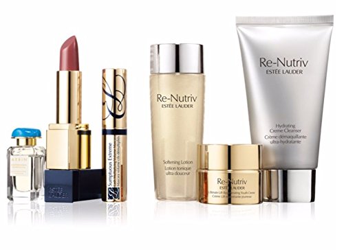 -. Title : Estee Lauder 7 pc Gift Set Re-Nutriv Skincare, Pure Color Lipstick, Sumptuous Extreme Mascara, AERIN perfume, Makeup Bag Tote