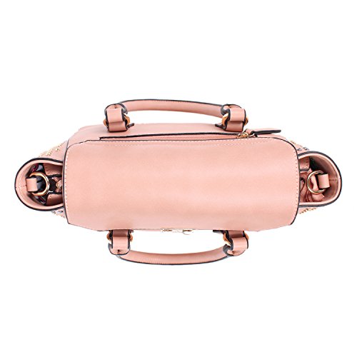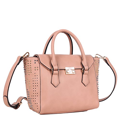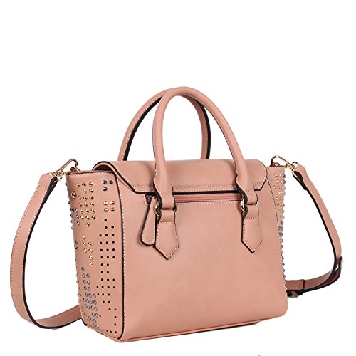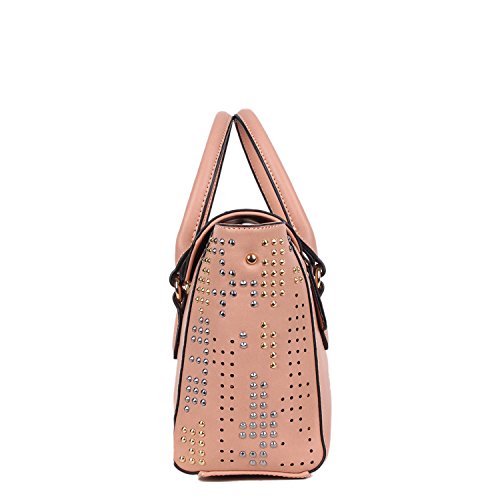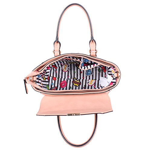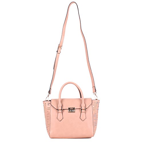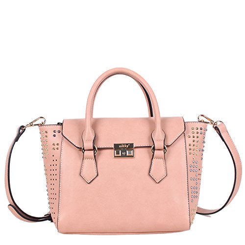 An edgy to street look is what the Nikky Satchel Bag accomplishes with its winged studded silhouette. Exterior Features: Made of smooth high quality eco-leather. Squared flap with Nikky signature logo on a gold-tone plated push clasp-fastened closure. Solid color with fine stitching detail. Back zipper pocket. Gold and Silver circle stud embellishments on winged sides. Boxy structured silhouette accented with contemporary gold-tone hardware. Flat base to provide upright structure. Dual top 5.5" drop eco-leather handles. Includes one adjustable and detachable 45" - 50" eco-leather shoulder strap. Interior Features: This structural piece opens to reveal a spacious lined satin printed stripe interior. Fitted with a zip wall pocket at back and two open wall accessory pockets at front. For cleaning, wipe with damp cloth.Feature