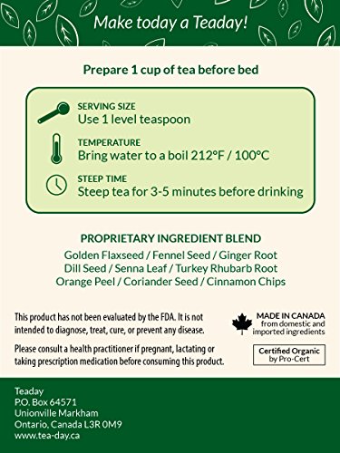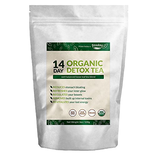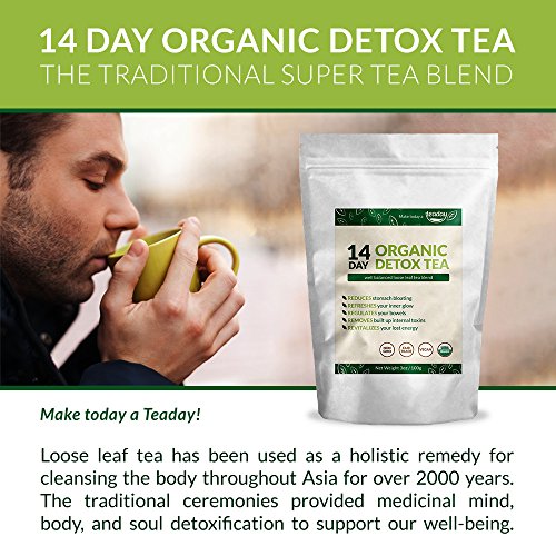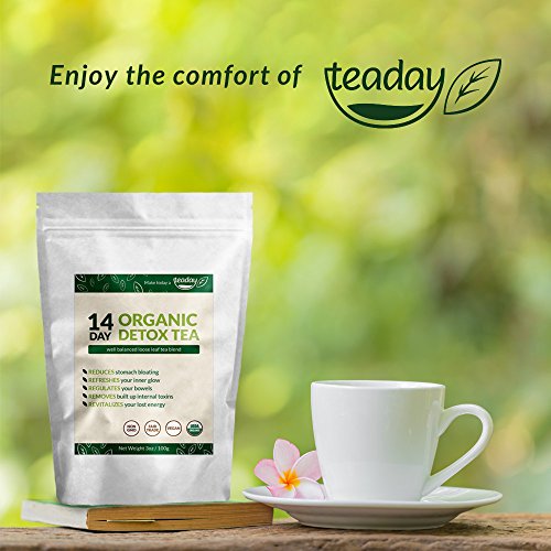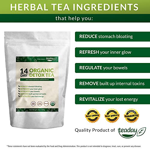 -. Binding : Health and Beauty -. Brand : the best value detox brand, Teaday. -. Color : White "Zip Lock Style" Pouch Bag -. EAN : 0735255281729 -. Feature : The "5 Star" points for our 14 Day Organic Detox Tea is listed right on our packaging. / We're Saying "Good ridden's!" ~ Rid yourself of food particle buildup which leads to "stomach bloating" / Our tea formula is specifically designed using a traditional holistic tea combination which engages with your digestive system to help release the built up intestinal "cling-on's" / It's common to feel, and see your skin become healthier during your detoxing. / 14 Day's to a healthier self start's by choosing to "Make today, a Teaday!" with our certified organic, and safety conscious cleansing system. -. IsAdultProduct : 0 -. Label : Teaday -. LegalDisclaimer : These statements have not been evaluated by the Food & Drug Administration. This product is not intended to diagnose, treat, cure or prevent any disease. The information herein is NOT a substitute for medical advice. ALWAYS consult your doctor or pharmacist before using any of our products. -. Manufacturer : Teaday -. ProductGroup : Health and Beauty -. ProductTypeName : HEALTH_PERSONAL_CARE -. Publisher : Teaday -. Studio : Teaday -. Title : 14 Day Detox Tea for Improving Digestion. Reducing Bloating. Cleansing Toxic Build Up. Certified Organic -. UPC : 735255281729