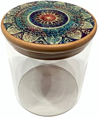 Blue Mandala Bamboo Glass Jar 700ml Herb & Spice Jars Storage Stash Container Large Smell Proof Air Tight Seal (Blue Mandala)