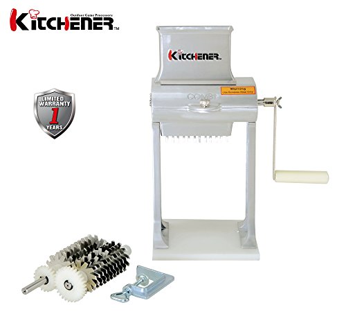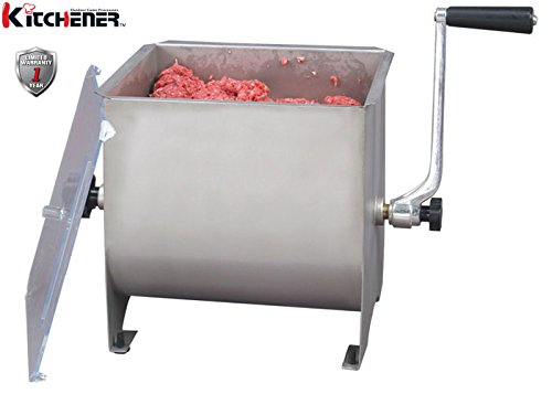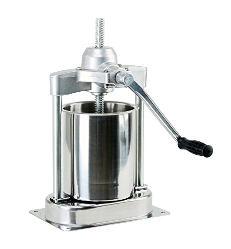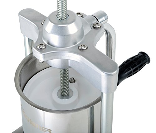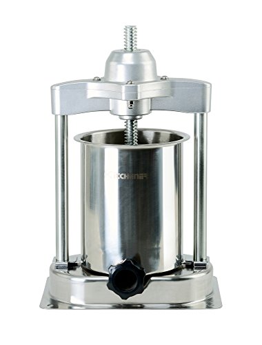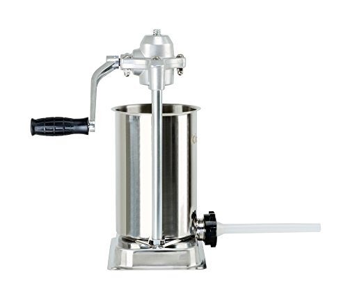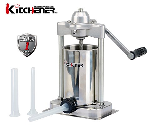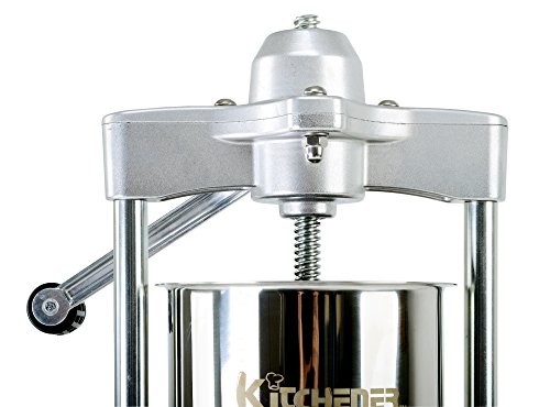The Kitchener 56031502 15-lbs Heavy Duty Stainless Steel Sausage Stuffer is the perfect stuffer to make sausages at home. It features a metal gearbox and two steel bars to create a reliable and durable frame. The metal gearbox of covering all steel gears makes the structure safe and sanitary. Stainless steel SUS304 cylinder is easily removed for filling and cleanup. Stainless steel base with holes is easy attached to any tabletop. Heavy-duty piston comes with a stainless steel air relief valve. Includes three stuffing tubes in 3/4", 7/8" and 1-1/4" diameter.Feature