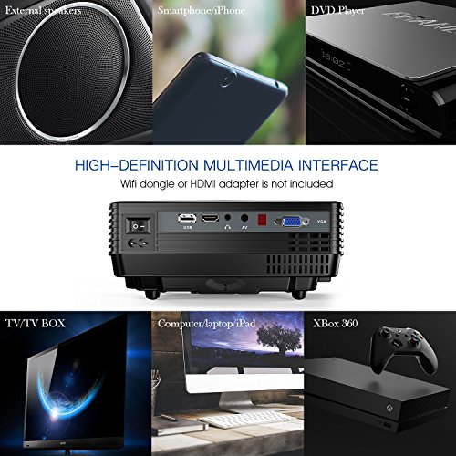 Multimedia Video projector: This Mini projector can be connected to your Amazon Fire Stick, TV Box, DVD player, PCs, Tablet, Laptops, PS3, Xbox, USB flash drive, iPad, iPhone, Android Smartphone ( Wireless HDMI Dongle not included).