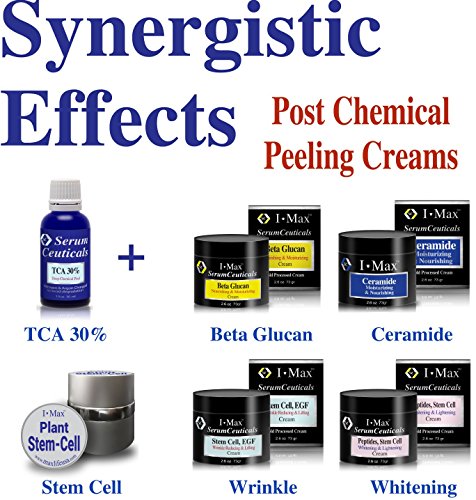 TCA for Deep Chemical Peel is a non-toxic chemical (Trichloroacetic Acid), which has been used to perform skin peels over 25 years. TCA makes the top layers of skin cells dry up and be peeled off over a period of one to two weeks. The skin turnover rate is significantly promoted by TCA. After the old skin is peeled off, a new layer of undamaged skin is exposed. It has smoother texture and lighter and more even color. I Max 30% Trichloroacetic Acid Serum-Deep Chemical Peel is a great facial serum for tightening, lifting, wrinkle reducing, antiaging and fading dark spots. Unlike other chemical peel products, this serum is formulated very uniquely with effective actives for nurturing, soothing, healing and hydrating like Vitamin Bs, Beta glucan, Chitosan, Botanical extracts and etc.