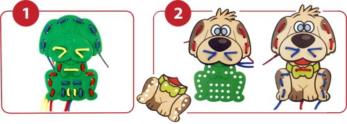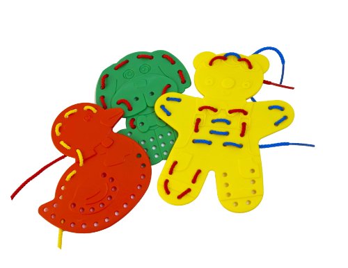 - 3 thick animal silhouettes are used for sewing and also as stencils for coloring; 9 braided laces included, plus worksheets and lace-up decorations