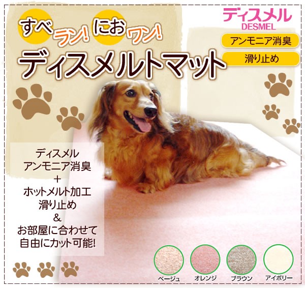 ディスメルトマットは、ディスメル繊維により、愛犬・愛猫ちゃんのトイレ(尿)等の嫌な「アンモニア」を吸収・消臭!裏面のホットメル加工でペットがマットの上で転ぶのを防ぎます!
