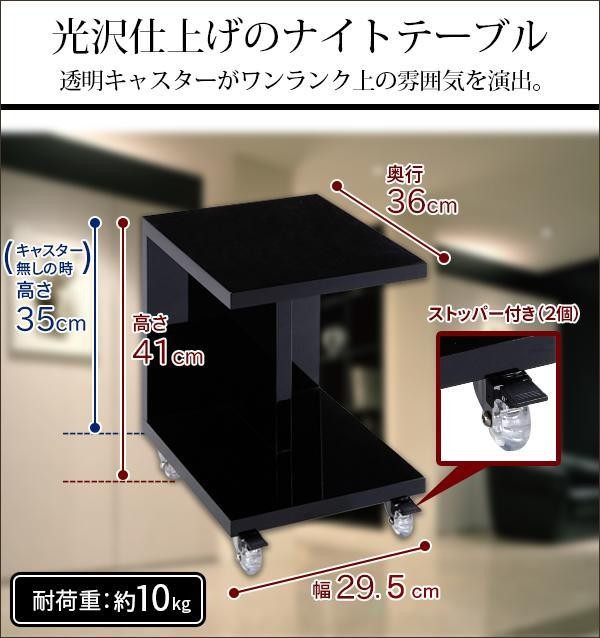 光沢感と透明なキャスターがワンランク上の雰囲気を演出するナイトテーブルです。キャスター4個の内、2個はストッパー付き。キャスター無しでの使用も可能です。ベッドサイドにあると便利♪ |