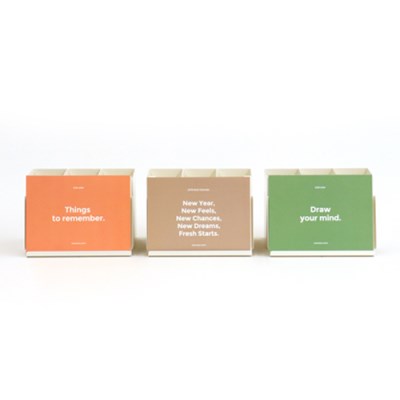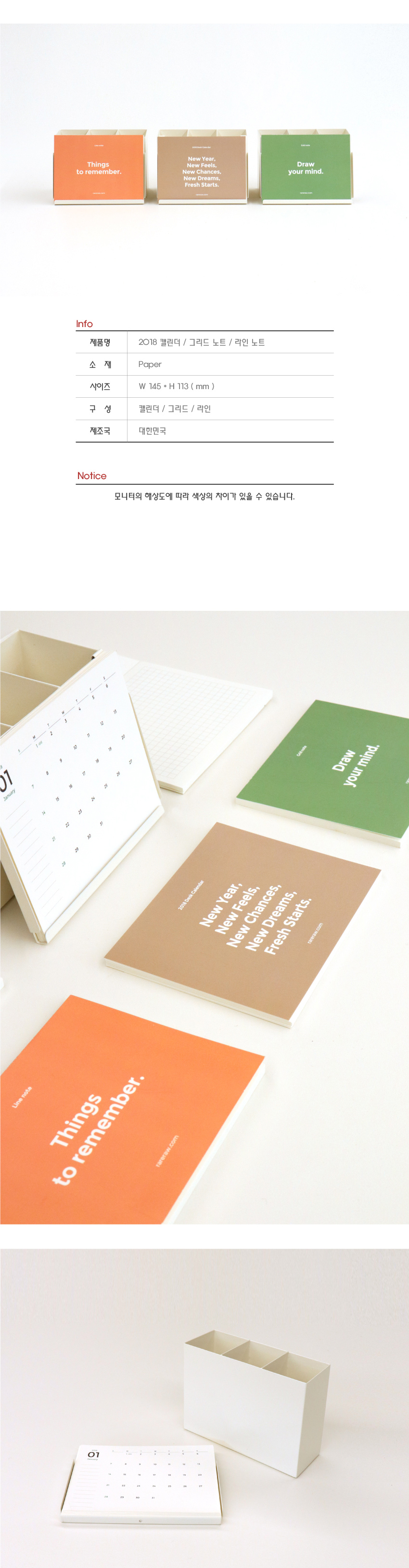 캘린더는 낱장으로 구성되어 있고, 노트는 떡메모지 형식으로 한 장씩 떼어 사용합니다.