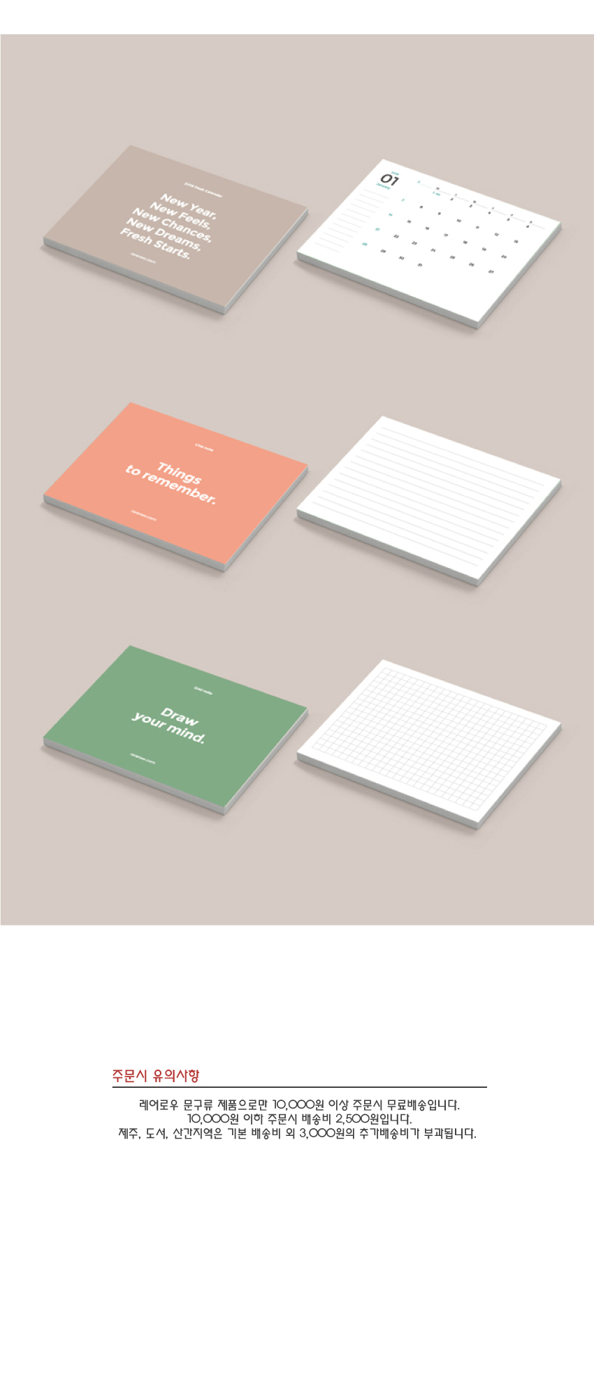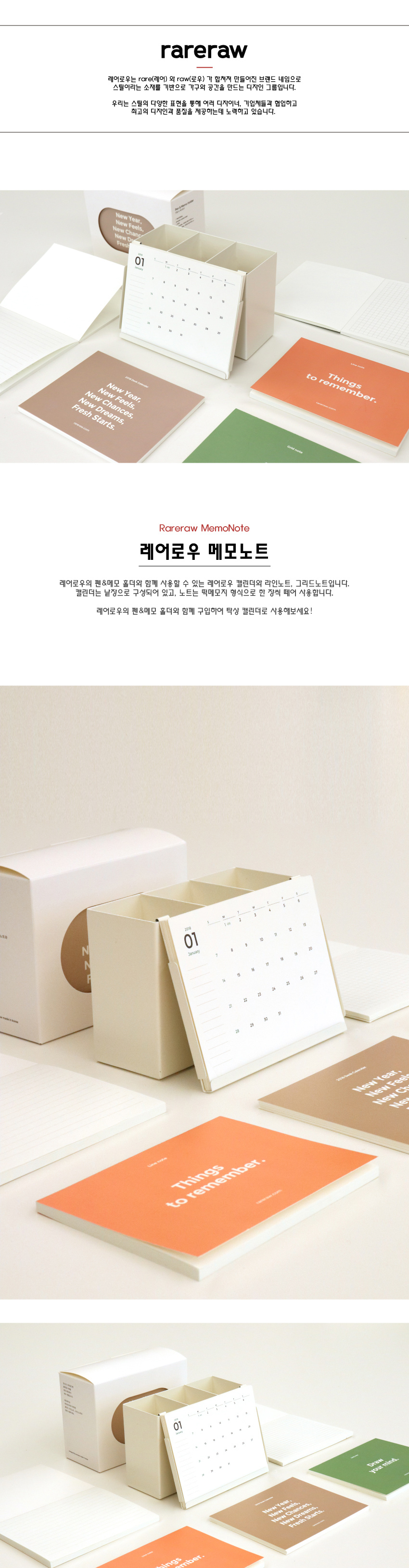 레어로우의 펜&메모 홀더와 함께 사용할 수 있는 레어로우 캘린더와 라인노트, 그리드노트입니다.
