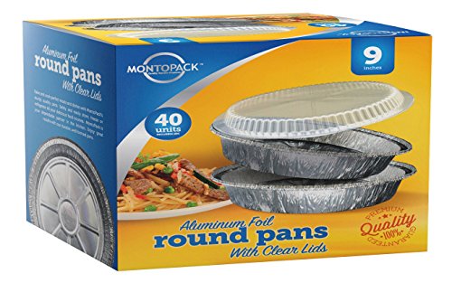 -. Title : 9 Inch Round Tin Foil Pans with Clear Plastic Lids - Freezer & Oven Safe Disposable Aluminum - For Baking, Cooking, Storage & Reheating - Pack of 40 - By MontoPack