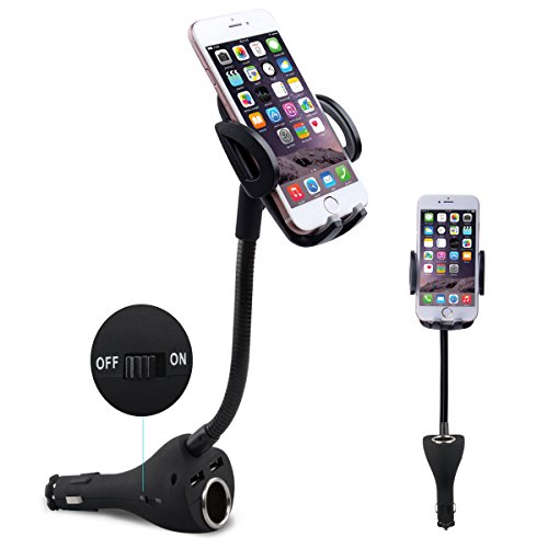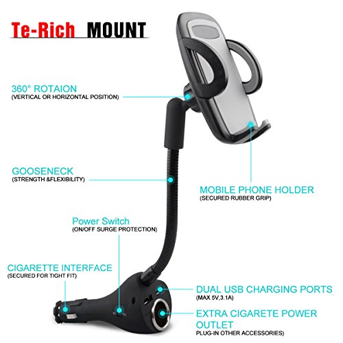 Te-Rich 3-in-1 Universal Car Mount Holder Phone Charger Cigarette Lighter Power Adapter for iPhone, Samsung Galaxy and More Smartphones (1 Power Outlet, Dual USB, 4.8A Max)