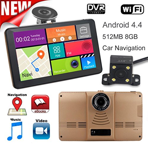 -. Feature : 7 inch HD iPS capacitive screen, quad-core CPU, 512M graphics card, 8G memory, blue anti-glare lenses / Built-in high sensitivity GPS module, external GPS antenna, the satellite signal can be received faster and more accurate. / Dual camera channel. Front 140 ° HD camera with DVR functionality to support full HD 1080P video; Rear view camera. / Support G-sensor, wifi, FM transmitter, circulation records and other functions. The new Android 4.4 system, WiFi network high-speed Internet, mass APP Download, massive online map support. / Package Included: 1x Rearview mirror car DVR(with two soft bandages); 1x Car charger; 1x Backup camera and AV In lin; 1x A line used to 24 hours park monitoring(about 3m); 1x USB cable; 2x Screws