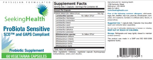 -. Feature : Probiota Sensitive provides 25+ billion colony forming units (CFUs) per capsule to help establish and maintain a balanced, healthy intestinal microflora. / Contains 12 certified Lactobacillus and Bifidobacterium species with well-documented benefits for gastrointestinal and immune health. / No need for cold pack, Probiota Sensitive will maintain potency for about 2 months at higher temperatures (86 F). / Physcian formulated. Laboratory tested to ensure label potency & purity. / Free of Inulin or FOS, Streptococcus, Casein, Corn, Dairy, Egg, Fish, Gluten, Peanuts, Shellfish, Soy, Tree Nuts, Wheat.