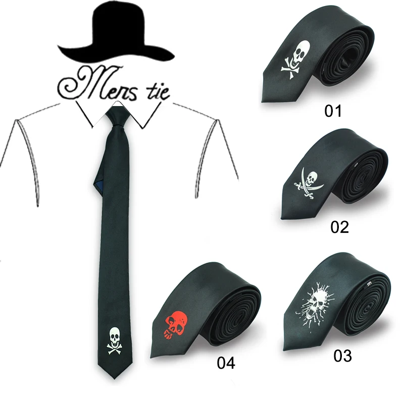 Ties Type: Neck Tie Pattern 1: white Cross ghost black Pattern 2: broadsword skull Black Pattern 3: scary skull black Pattern 4: red skull black Pattern 5: cross-bones skull red 1 Pattern 6: cross-bones skull red 2 Width/Length: trendy classic fashion funny Style1: Polyester ties for men slim ties 2015 Style2: party neckties casual ties Style3: gravatas gravatas corbata