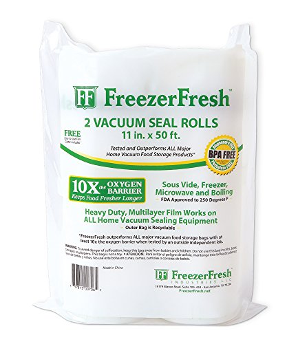 Freezer Fresh 11" x 50' Vacuum Seal Rolls contain a Heavy Duty, Multilayer film that works on ALL Home Vacuum Sealing Equipment. Freezer Fresh's Vacuum rolls outperform ALL major vacuum food storage bags with a minimum 10X the oxygen barrier when tested by an outside independent lab. With Freezer Fresh products you and your family will enjoy food that tastes fresher and lasts longer than ever before. We know that food is expensive, which is why we developed Freezer Fresh to help protect your food investment and experience the taste of food how it was intended.Feature