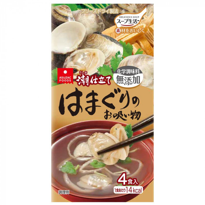 大きめのはまぐりの濃厚な出汁に、魚介出汁を合わせ、塩で旨みを引き立てた潮仕立てのお吸い物です。具材に国産の三つ葉、お麩を加え、上品な味わいに仕上げました。フリーズドライ製法のため、はまぐりの食感や具材感をお楽しみいただけます。 |