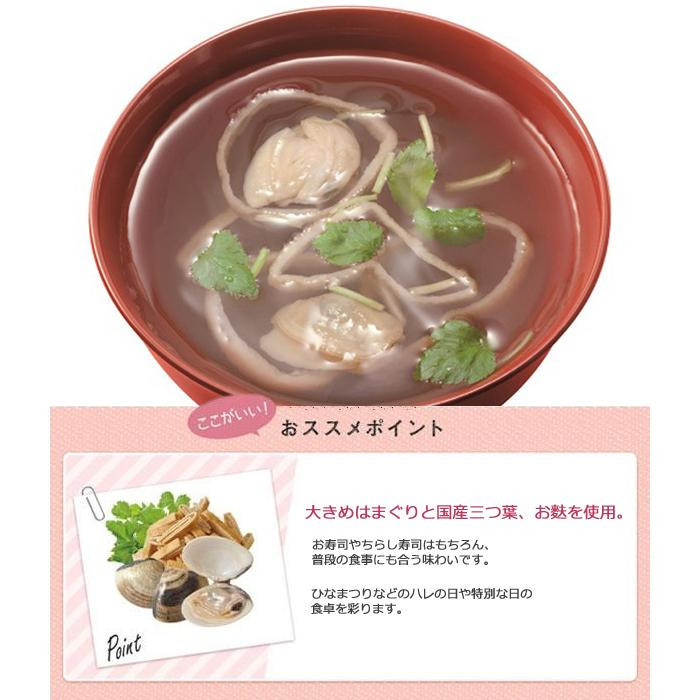 | 原材料 | 名称:即席吸物 はまぐり、発酵調味料、魚介エキス、みつば、澱粉、食塩、麩、昆布エキス、砂糖、かつおだし、酵母エキス、椎茸エキス、酸化防止剤(V.E)、(原材料の一部に小麦、大豆を含む) |