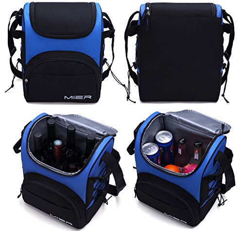 -. Feature : MIER lunch cooler bag made of Durable dirt-proof material with food safe and Eco-friendly PEVA liner; Insulated to keep your food warm or cold, would be better if you throw a cold pack inside if long distance. Lunch bag Dimensions:10.2''L*6.7''W*12.2''H, rather tall enough to hold 2 liter bottle / Main compartment with 2-way zipper opening flaps which makes it easy to take out food and snacks, roomy enough to pack a lunch for 2 in or 16cans. One large zip around front pocket with a slide pocket which can put utensils, can opener, napkins, wallet, keys, etc / Two side bungee cords to hold a beverage bottle or a box of crackers tightened with the support pouch at the bottom. Nice feature is two handles on the side making it easy to grab out the car or from across the table. Shoulder strap could adjust from 23'' to 43'', great for a male or female, and even kids / This insulated bag perfect for outdoor picnic, multiple meals for someone who has long work hours, or to take snacks along on a road trip with the family, awesome huge lunch bag / Design for camping picnic bag, lunch to work, the beach, cooler bag, food carrier, travel cooler, food storage bag, wine cooler bag etc