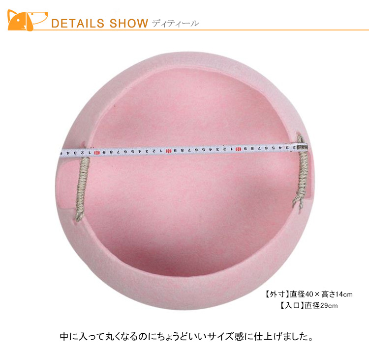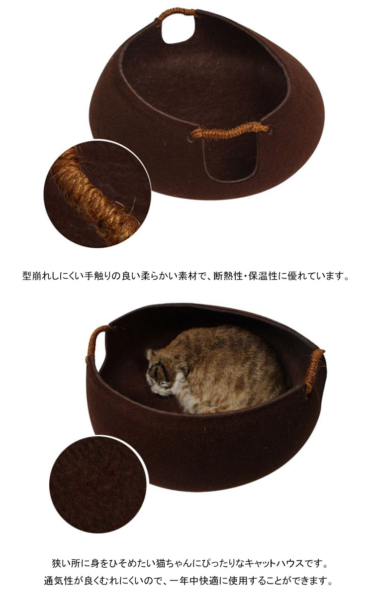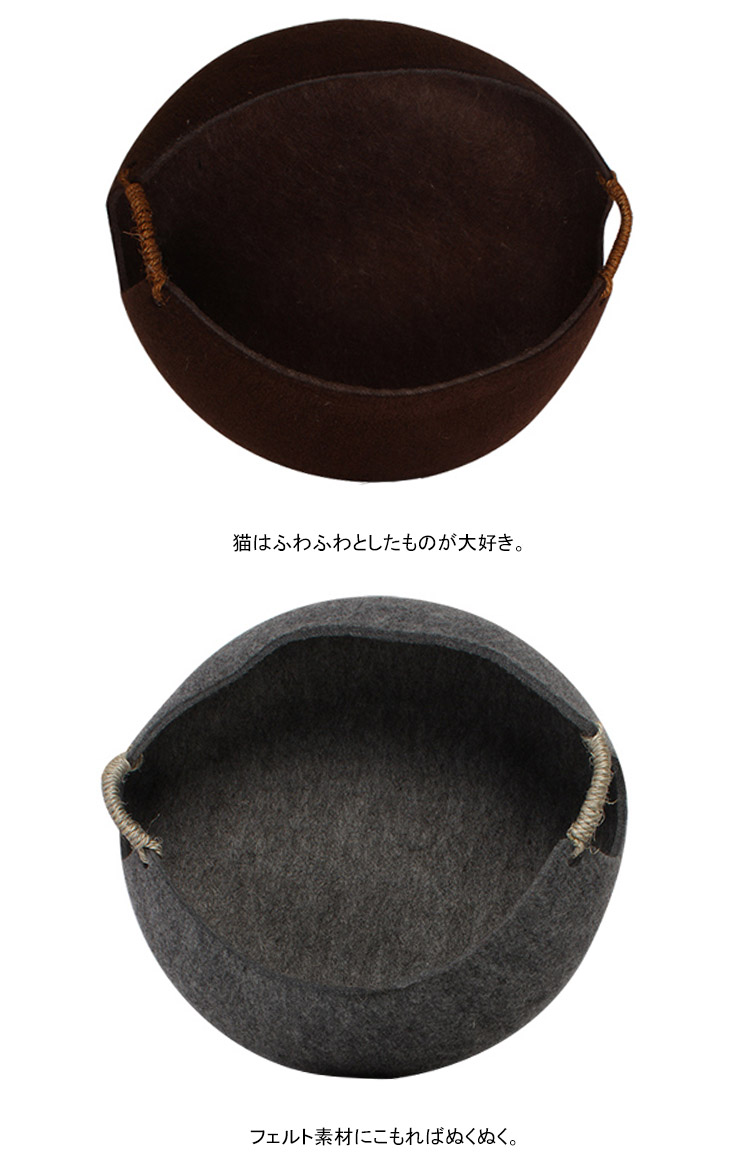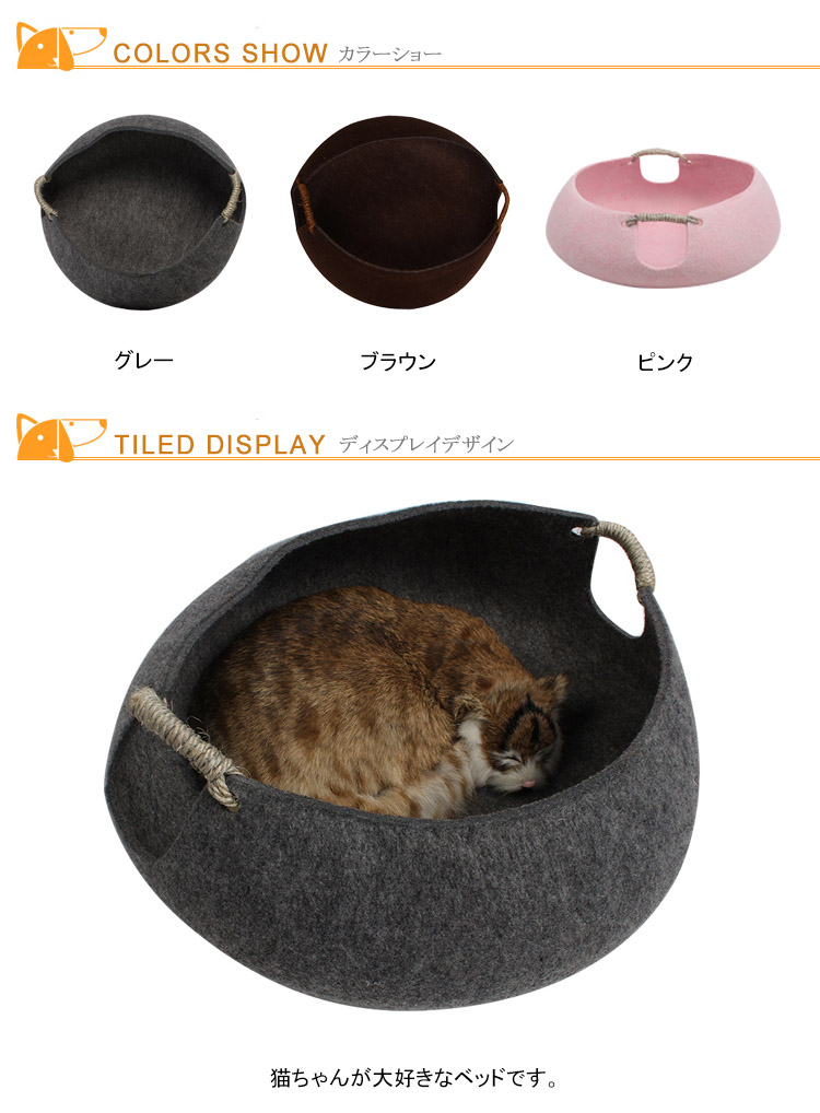 | 猫ちゃんが大好きなベッドです。猫はふわふわとしたものが大好き。フェルト素材にこもればぬくぬく。気持ちの良いやわらかさで断熱性、保湿性に優れています。丈夫で軽いので、入った状態で抱っこもOK! | |