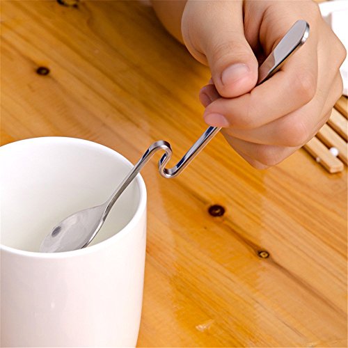 Product Description Made of stainless steel, durable and dishwasher safe Specifically designed coffee tea spoon with a curved handle to hang the spoon securely on jar, cup, mug, and bowl rims Keep your table surfaces clean Not only great for honey but also perfect for coffee,yogurt, ice cream, cheerios, pudding, cottage cheese Package includes 5 honey spoons 0