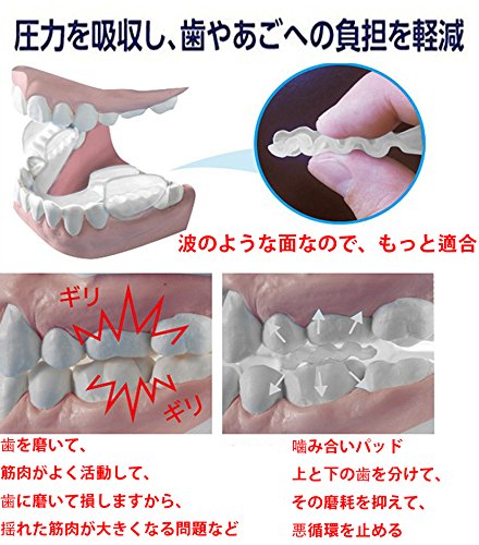 And product design is small, foreign body sensation more less, is a well-bass feelings Once you wear. Because the surface, such as a wave, more fit, brush your teeth, muscles well active, because you and lose brushing the teeth, divided the teeth of Paddo meshing such problems shaking muscles increases above and below, the wear suppressed, the tooth cover for use in stopping the vicious circle, medical material, safety, long-lasting, use convenient, instead of covering the whole tooth as comfortable you can wear the mouthpiece, the impact of the three points of the back teeth, the front teeth to achieve no fit sense of discomfort to absorb a pin point, it reduces the stress at the time of attachment to the limit. Safe and safe to use, this product is adopted EVA resin that meet the safety standards. You can be hygienically stored in a dedicated case care is also easy. Carry also the time of business trip and travel is convenient. We will deliver our original package. Tooth-type form is not needed. You do not need a troublesome time that ... take a tooth to soften immersed in hot water. Ha圧 absorption structure will fit into your tooth by changing the form. Because the type of only fitting to discomfort reduce back teeth at the time of wearing, without discomfort than the whole of the attachment, you can sleep in comfort. How to Care will use a mild detergent When you have finished using very simple, please washed with 40 ℃ or less of hot water or water. The shade in a location that is not exposed to direct sunlight, please keep in a special case from the dry well.